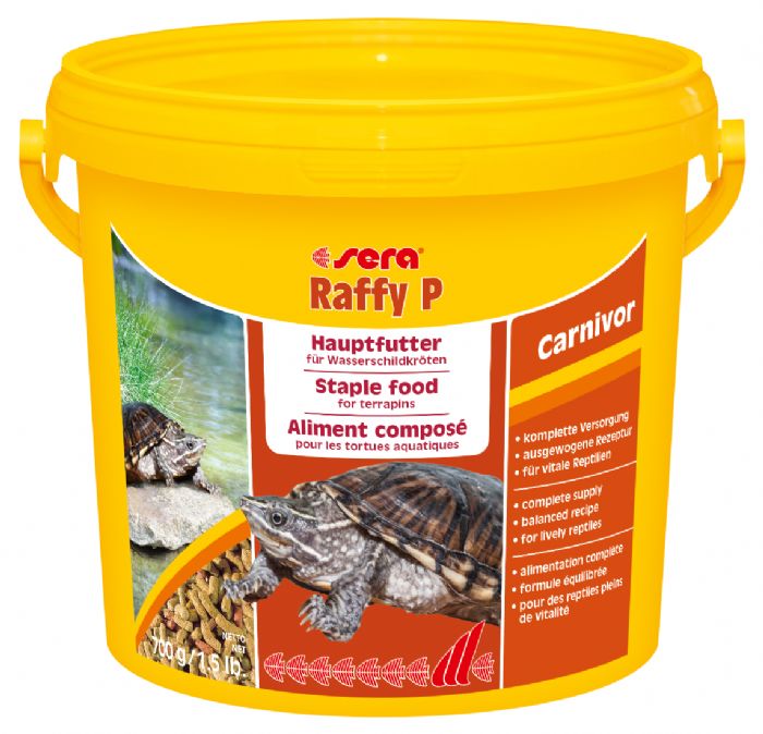 Sera Raffy P, tüm su kaplumbağalarıyla sürüngenler için mükemmel, bir temel yemdir. Kara kaplumbağaları ve bataklık kaplumbağaları içinde uygun ve leziz bir yemdir. Yüzen yem çubukları (stikler) şeklindedir. Kaplumbağaların ve sürüngenlerin beslenme ihtiyaçlarını karşılayacak şekilde doğalarına uygun olarak üretilmiştir. Zengin kalsiyum içeriği ile iskelet ve güçlü kabuk oluşumunu destekler.