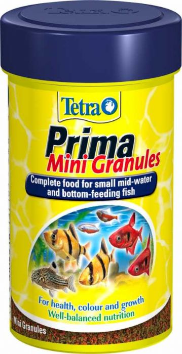 "Tetra Prima Mini Granül; Dipte, ortada ve yüzeyde beslenen tropikal balıkların, enerji ihtiyacını karşılayan rengini ve canlılığını koruyan, boyutları küçük granül formunda ana yemdir. * Melek balığı, Kedi balığı, Tetra gibi diplerde, yüzeyde ve suyun or