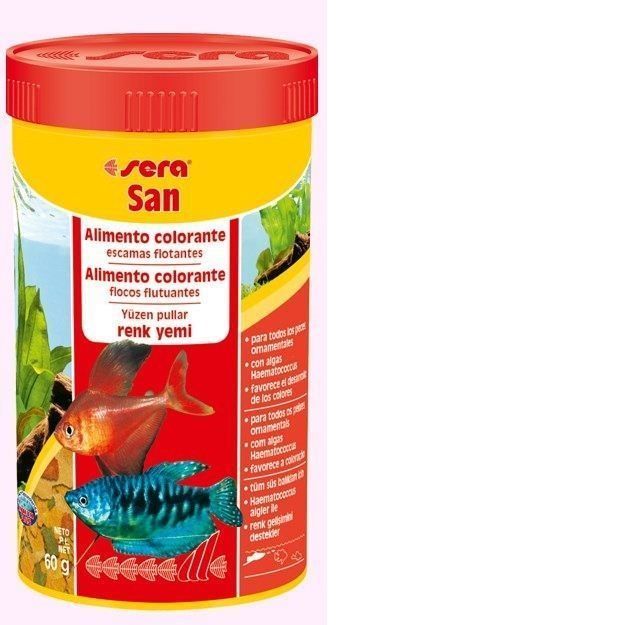 Tüm süs balıkları için renklendirici pul yemdir. Yüksek miktarda deniz algi ve spurilina yosunu içeren sera san, renk pigmentlerini harekete geçirir, balığın doğal renklerinin ortaya çıkmasını sağlar. Düzenli olarak kullanıldığında renklerde kısa sürede gözle görülür canlanma sağlamanın yanısıra balığın hızlı büyümesinde önemli rol oynar.