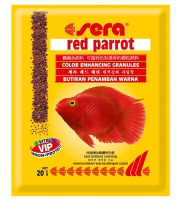 Sera Red Parrot özellikle papağan çiklid balıkları için geliştirilmiş yüzen bir granül yemdir. Özenle seçilmiş hammaddelerin dikkatlice işlenmesiyle yapılmıştır. bu etkileyici balıkların özel gereksinimlerini karşılamak amacıyla çok iyi dengelenmiştir. doğal renklendiriciler sayesinde çok kısa bir sürede bu balıkların görkemli renklere kavuşmasını sağlar.