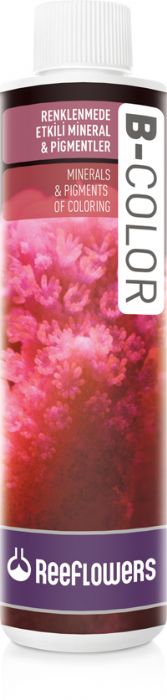 ReeFlowers B-Color, mercanların renklenmesinde etkili olan pigment ve elementleri içerir. Canlılarda yaşamsal fonksiyonları hızlandırır, pH seviyesini tamponlar, büyümeyi tetikler, daha sağlıklı ve dirençli olmaları için gerekli ortamı sağlar. Canlıların daha parlak renklere sahip olmasını, özellikle pembe, mor ve mavi renklerin belirginleşmesini sağlar.