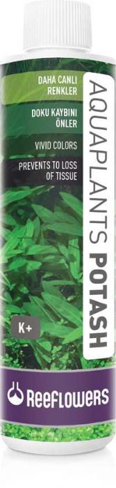 ReeFlowers AquaPlants Potash, yüksek yoğunlukta potasyum çözeltisidir. Bitkili akvaryumlar için özel olarak formüle edilmiştir. 1 lt’de en az 40.000 ppm potasyum içerir. Potasyum bitki gelişimi ve sağlığı için en önemli elementlerdendir. Fotosentezde kullanılır ve bitki dokularında gerçekleşen birçok biyokimyasal reaksiyon için oldukça önemlidir. Potasyum eksikliği bitkilerde yaprak renklerinde solmalara, genellikle dış kenar kısımlardan başlamak kaydıyla doku çürümelerine ve eksiklik giderilmediği taktirde yeterli klorofil üretilememesi sonucu ölümlere sebep olur. Ortalama yükteki bir bitkili tatlı su akvaryumu için 100 lt’ye haftalık 5 ml kullanılması tavsiye edilir. 5 ml çözelti 100 lt’de 2 ppm artış sağlar.