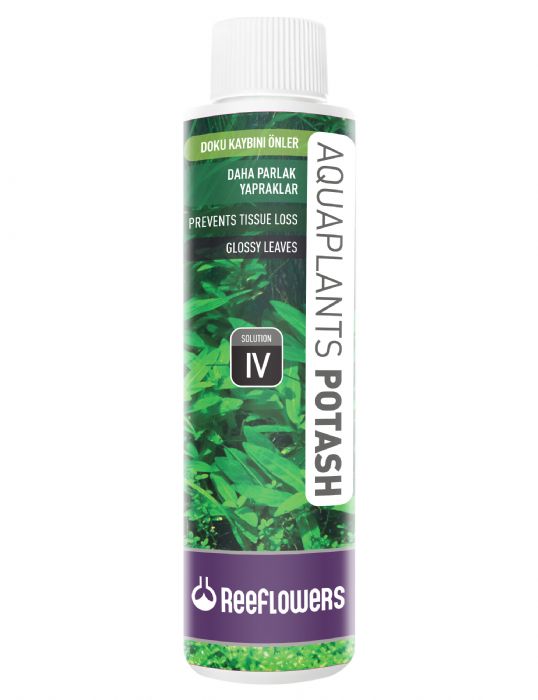 ReeFlowers AquaPlants Potash, yüksek yo?unlukta potasyum çözeltisidir. Bitkili akvaryumlar için özel olarak formüle edilmi?tir. 1 lt’de en az 40.000 ppm potasyum içerir. Potasyum bitki geli?imi ve sa?l??? için en önemli elementlerdendir. Fotosentezde kullan?l?r ve bitki dokular?nda gerçekle?en birçok biyokimyasal reaksiyon için oldukça önemlidir. Büyümeyi h?zland?r?r, kök geli?iminde etkilidir. Potasyum eksikli?i bitkilerde yaprak renklerinde solmalara, genellikle d?? kenar k?s?mlardan ba?lamak kayd?yla doku çürümelerine ve eksiklik giderilmedi?i taktirde yeterli klorofil üretilememesi sonucu ölümlere sebep olur. Bitkili akvaryumlarda potasyum 20-30 ppm aral???nda tutulmal?d?r.