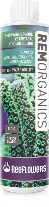 Akvaryumda yaşayan canlılar tarafından üreme, savunma, vb. sebepler ile salgılanan organik maddeler ve feromonlar diğer canlılara zarar verebilir. ReeFlowers RemOrganics, akvaryum suyunuzu organik ve inorganik zararlılardan arındırır, su kalitesini arttırır. Su değişimlerinde ve ilaç tedavisi sonrası suyu temizlemek, yeni canlı eklenirken canlının suya adaptasyonunu kolaylaştırmak, stres riskini azaltmak ve canlıların nakliyesi esnasında suyun bozulmasını geciktirmek amacıyla kullanılır. Amonyak, klor ve ağır metalleri giderir. Tatlı su ve tuzlu su akvaryumlarında kullanılabilir. Balıklara, bitkilere, resif canlılarına, faydalı bakteri kolonilerine ve faydalı mikro organizmalara zarar vermez. pH seviyesinde değişikliğe sebep olmaz. Toksik değildir. Uygulama esnasında protein skimmer, aktif karbon, vb. mekanik, kimyasal veya biyolojik filtrelerin kapatılmasına gerek yoktur.